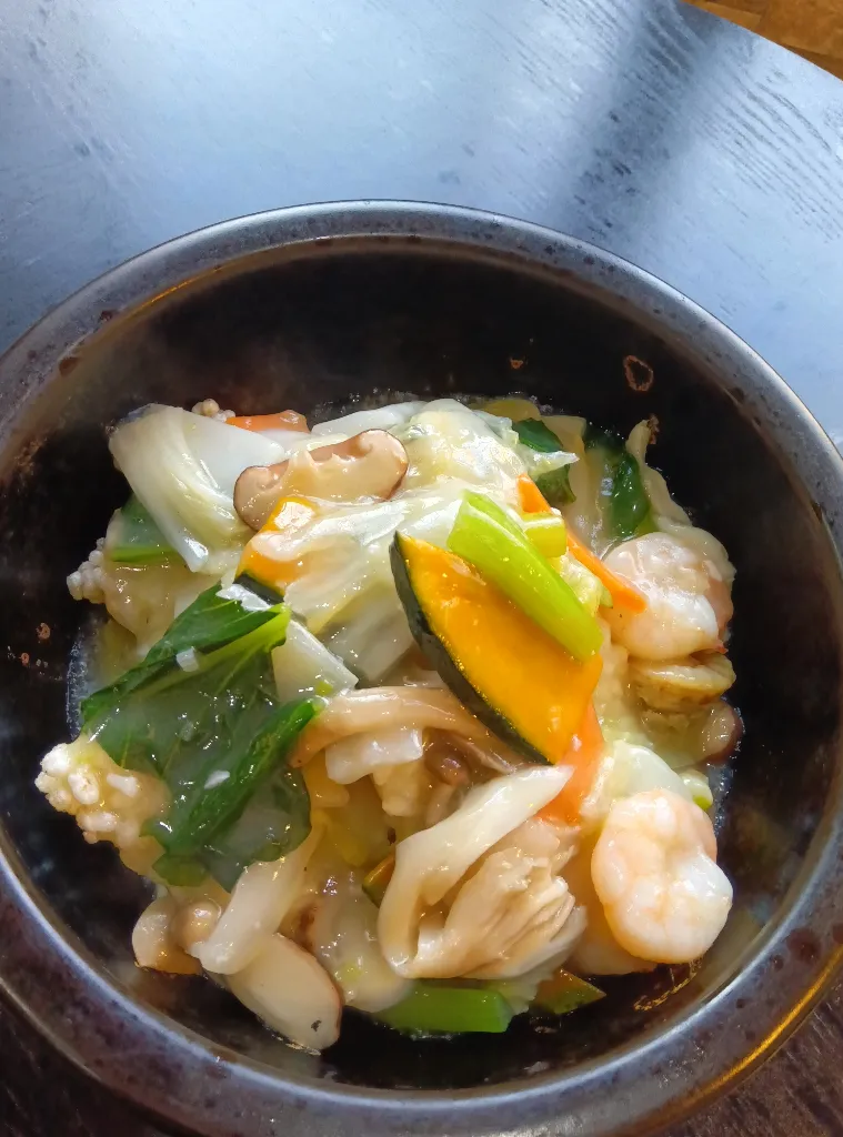 新鮮な海老、イカ、ホタテ🦑🦐をたっぷり使用!サクサクに揚がったおこげに、スダチが香るトロトロのあんかけをジュワ〜っと豪快にかけます🔥。